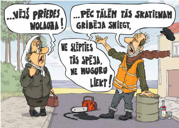 “Nu, jā… Tā viņas dara…” Simboliski, ar vērienu un patiesi dziļi filozofiski vērtē situāciju pilsētā arī mūsu Komunālās pārvaldes runasvīri (vai varbūt runassievas?). Un ko gan šajā situācijā darīt? Neko īpašu, jo tā taču tas lietus, vējš un mainīgais klimats kokiem dara. Tiesa gan, šajā konkrētajā gadījumā Komunālās pārvaldes darbinieki situāciju ir atrisinājuši – koka zaru apzāģēšana veikta… Par citiem kokiem, kas “negatīvi ietekmēti” informācijas nav.